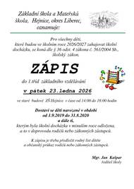 Tento pátek 23. ledna proběhne zápis do prvních tříd ZŠ Hejnice. Ve staré budově ZŠ Hejnice v čase od 14:00 do 18:00 hodin. Dostaví se děti narozené v období od 1.9.2019 do 31.8.2020 a dále ti, kterým byla školní docházka v minulém roce odložena, a to v doprovodu rodičů nebo zákonných zástupců. K zápisu je třeba předložit rodný list dítěte a občanský průkaz rodičů nebo zákonných zástupců. Mgr. Jan Kašpar, ředitel školy
