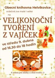 Obecní knihovna Helvíkovice zve malé i velké na Velikonoční tvoření z vajíček ve středu 9. dubna od 16.30 do 18 hodin. S sebou jen nůžky a chuť tvořit :)