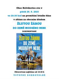 Zveme vás na letní kino v Helvíkovicích, které se koná v pátek 29. srpna 2025, otevřeno od 19.30 h. Můžete se těšit na cestopisný film "Žlutou žábou do země modrého nebe", promítá se od 20.30 h, občerstvení zajištěno. Vstupné je dobrovolné, tak neváhejte přijít!