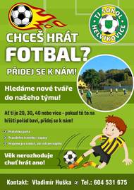 Pokud máš zájem hrát fotbal, přidej se k nám! TJ sokol Helvíkovice hledá nové členy do týmu, kteří chtějí zažít pravidelné tréninky a zápasy. Naším cílem je hrát pro radost a užívat si týmového ducha. Kontakt: Vladimír Huška, tel.604 531 675
