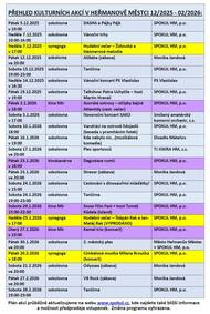 Přinášíme Vám souhrnný přehled akcí v Heřmanově Městci a okolí na měsíc leden 2026. Plesy, přednášky, výstavy, filmový festival, tančírna, výlety, koncerty, taneční zábava a řada dalších akcí, to je velmi pestrá nabídka i v prvním měsíci roku.