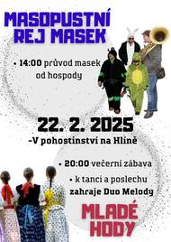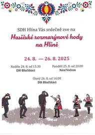 Stárci letošních hodů společně s SDH Hlína Vás srdečně zvou na Hasičské rozmarýnové hody konané ve dnech 24.8. - 26.8.2025. Při této příležitosti se obrací starosta hasičů a stárci s prosbou o pomoc při dovezení hodové máje ve čtvrtek 21.8. v 17.00 hodin sraz před hospodou a o pomoc při přípravách prostorů pro konání hodů v sobotu 23.8. v 9.00 hodin na place.