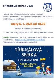 Tak jako každý rok, i letos k Vám přijdou koledníci a budou rozdávat radost a požehnání, a také prosit o příspěvek na lidi v nouzi a sociální služby. Koledníci vyjdou v naší obci v sobotu 11. 1. 2025 a budou mít s sebou pokladničku. Ti z Vás, kteří chtějí přispět, ale v době koledy nebudete doma, můžete využít přispění on-line koledou (převodem na účet, dárcovskou sms nebo on-line pokladničkou - tisnov.charita.cz/trikralova-sbirka/). Přispívat však můžete pravidelně celoročně.