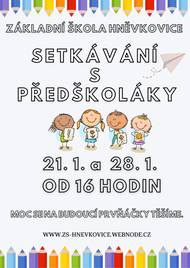 ZŠ HNĚVKOVICE POŘÁDÁ VE DNECH 21. 1. 2026 A 28. 1. 2026 VŽDY OD 16:00 SETKÁVÁNÍ S PŘEDŠKOLÁKY. VÍCE INFO: WWW.ZS-HNEVKOVICE.WEBNODE.CZ