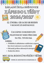 ZÁPIS DO 1. TŘÍDY 2026/2027 ZŠ HNĚVKOVICE KDY: 12. 2. 2026 ČAS: 14:00 - 18:00 VÍCE INFORMACÍ NA TEL.: 739 052 566