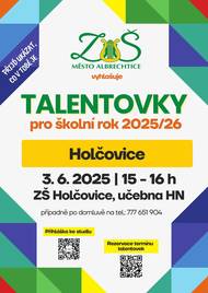V úterý 3.6.2025 od 15:00 se uskuteční talentové zkoušky v ZUŠ Město Albrechtice pro děti ZŠ Holčovice.