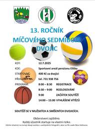 Příští sobotu 12. července se uskuteční 13. ročník Míčového sedmiboje mužských a smíšených dvojic. Tato tradiční sportovní akce se uskuteční ve sportovním areálu penzionu Eliška. Registrovat se můžete na tel. 731938756. Pro účastníky turnaje bude zajištěno občerstvení.