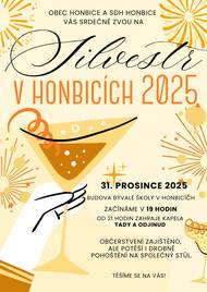 Obec Honbice a SDH Honbice občany Honbic a Libanic, ale i přespolní na oslavu Silvestra 2025 ve škole v Honbicích. Začínáme v 19:00, od 21:00 hraje živá kapela, končíme až v na Nový rok.