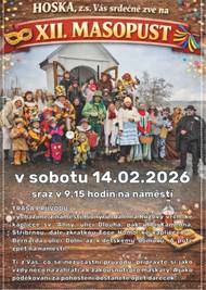 XII.Masopust začína v sobotu 14.2.. Sraz v 9:15 na náměstí. Medvědem budou do průvodu puštěny jen plnohodnotné masky (nestačí jen srandovní brýle apod.) . Poté následují zabíjačkové hody od 13:00 hod na sále Horského Domova.