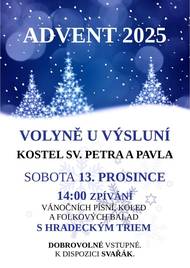 V sobotu 13. prosince se v kostele sv. Petra a Pavla ve Volyni u Výsluní uskuteční zpívání vánočních písní, koled a folklorních balad. Akce začne v 14:00 a vystoupí Hradecké trio. Během zpívání bude možné si zakoupit svařák. Vstupné je dobrovolné.