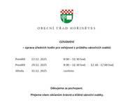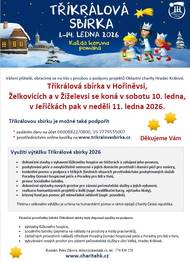 Tak jako každý rok, tak i letos se připojíme k dobru - Tříkrálová sbírka se bude konat v sobotu 10.1. 2026 v Hořiněvsi, Žíželevsi, Želkovicích a v neděli 11.1. 2026 v Jeřičkách. Ve všech obcích skupinky tří dětských králů s dospělým doprovodedm vyjdou cca v 9:20 hod. Tříkrálová sbírka podporuje Lůžkový hospic pro Hradecko ve Stežerách.
