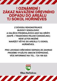 Před 9 dnyOznámení - zákaz navážení dřevního odpadu do areálu TJ Sokol HořiněvesZ důvodu rekonstrukce budovy Sokolovny a dalších probíhajících akcí na hřišti (např. i tradičního pálení čarodějnic) není letos možné navážet větve do areálu TJ Sokol Hořiněves. Pro likvidaci dřevního odpadu ze zahrad prosíme využijte obecní štěpkovač. Více informací na tel.: 724 186 825.