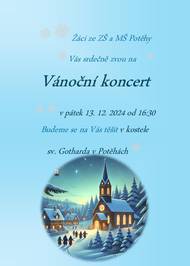 Přijďte si vychutnat vánoční atmosféru na koncert pořádaný žáky ZŠ a MŠ Potěhy. Akce se uskuteční v pátek 13. prosince 2024 od 16:30 v kostele sv. Gotharda v Potěhách.