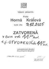 Pošta Horná Kráľová bude vo štvrtok 27.11.2025 otvorená do 11.00 hod