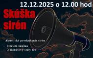 V súlade s usmernením č. SKR-OOR2-2024/001125-030 "Preskúšanie prevádzkyschopnosti systémov varovania v SR v roku 2025 - usmernenie" zo dňa 13.11.2024 a v súlade s prílohou č. 1 "Organizačné a technické zabezpečenie preskúšania prevádzkyschopnosti systémov varovania obyvateľstva v SR v 2025" Vám oznamujeme, že v piatok 12.12.2025 sa o 12:00 zrealizuje akustické preskúšanie elektronických sirén hlasitou skúškou.