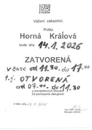 Pošta v Hornej Kráľovej bude v stredu 14.1.2026 otvorená do 11.30 hod