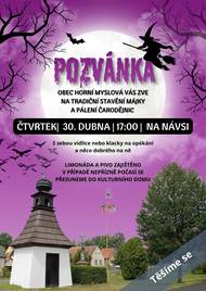 Obec Horní Myslová srdečně zve své občany na tradiční stavění májky a pálení čarodějnic, které se uskuteční 30. dubna v 17:00 na návsi. Limonáda a pivo bude zajištěno. Těšíme se na vás