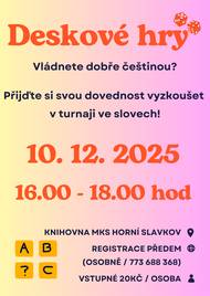 Vládnete dobře češtinou? Přijďte si svou dovednost vyzkoušet v turnaji ve slovech! Více v plakátu.