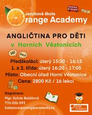 Angličtina pro děti v Horních Věstonicích Předškoláci: úterý 15:30 - 16:15 1. a 2. třída: úterý 16:20 - 17:05 Místo: Obecní úřad Horní Věstonice Cena: 2800 Kč/16 lekcí