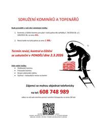 Sdružení kominíků a topenářů bude provádět v naší obci v PONDĚLÍ dne 2.3. požadované kontroly a čištění komínů pro plyn i tuhá paliva dle zákonu č. 34/2016 Sb. za následující ceny: Čištění komínů: 450 Kč Revize kotlů na tuhá paliva: 1.300 Kč