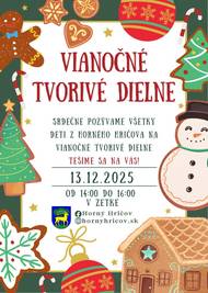 Obec Horný Hričov pozýva všetky deti z Horného Hričova na vianočné tvorivé dielne, na ktorých budú môcť deti vlastnoručne vyrobiť peknú vianočnú ozdobu alebo vyrobiť malý darček pre svojich najbližších. Dielne sa uskutočnia v sobotu 13. decembra 2025 od 14.00 h do 16.00 h v Zetke. Tešíme sa na Vás