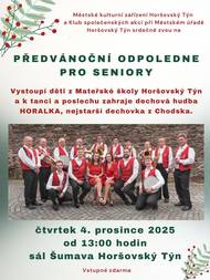 Vystoupí děti z Mateřské školy H. Týn a k tanci a poslechu zahraje dechová hudba Horalka, nejstarší dechovka z Chodska.