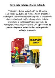 Dobrý den, informuji Vás, že v úterý 21. dubna v době od 9 do 17 hodin a ve středu 22.dubna od 7 do 11 hodin proběhne v obci jarní sběr nebezpečného odpadu. V uvedených dnech a hodinách můžete barvy, oleje, ředidla, chemikálie a elektrospotřebiče odevzdat do kontejnerů umístěných ve dvoře OÚ. Upozorňuji, že pneumatiky nelze v rámci sběru nebezpečného odpadu odevzdat. Zdraví starosta