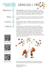 Vážení rodiče budoucích prvňáčků, zveme Vás k zápisu dětí do 1. tříd pro školní rok 2026/2027. Formulář, přes který budete děti přihlašovat, naleznete ZDE. Spuštěn bude 1. 1. 2026. Podrobné informace o termínech, organizaci zápisu, potřebných dokumentech a dalších náležitostech naleznete v přiloženém letáku.