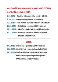 Plánované akce v Hostouni a v přilehlých obcích.2025:1.11.-Pouť ve Štítarech,Mše svatá v 10:00h,7.11.-Lampionový průvod se strašidly,9.11.-Mše svatá v kapli na hřbitově v Hostouni,15.11.-Diskotéka-pořádá JSDH Hostouň,28.11.-Vánoční zpívání a trhy od 16:00h,30.11.-Adventní koncert v Mělnici,zahraje SPOLEK NADŠENÝCH.2026-17.1.Diskotéka-pořádá LOKO Hostouň,21.2.-Hasičský bál,zahraje kapela DOZVUK.14.3.-Maškarní bál pro děti,od 14:00h,Maškarní bál pro dospělé s kapelou MAKADAM od 20:00h