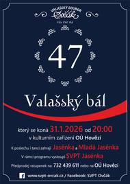 V pondělí 12. 1. 26 byl zahájem předprodej vstupenek na 47. Valašský bál, který pro vás pořádá SVPT Ovčák Těšit se můžete jako vždy na pěkný foklórní program a tradiční valašské pochutiny. Cena vstupenky s místenkou je 200,- Předprodej probíhá na OÚ Hovězí v kanceláři kultury anebo na tel.: 732439611