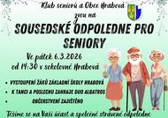 Klub seniorů a Obec Hrabová zvou dne 6. 3. 2026 od 14.30 hod. na Sousedské odpoledne pro seniory. Vystoupí žáci ZŠ Hrabová, k tanci a poslechu zahraje Duo Albatros. Občerstvení zajištěno.