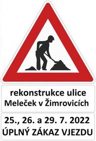 Upozorňujeme občany, že v ulici Meleček v Žimrovicích bude ve dnech 25., 26. a 29. 7. 2022 výrazně omezen provoz vozidel, a to z důvodu pokládky finální vrstvy asfaltu na komunikaci.