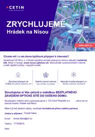 Před 24 dnyZjištění zájmu o optickou internetovou přípojku k Vašemu domuSpolečnost CETIN a.s. plánuje připojovat domy ve Vaší obci na novou optickou síť. Připojení domu bude zcela zdarma. Společnost O2 zjišťuje pro společnost CETIN zájem obyvatel o tato připojení. Současně Vám společnost O2 může představit i nabídku internetu za speciální cenu pro Vaši lokalitu. V čem je optický internet lepší než stávající internet vzduchem nebo telefonním kabelem: Rychlost až 2000 Mb/s – tzn. mnohonásobně rychlejší ve srovnání s Vaší dnešní přípojkou Příjem digitální televize – vysoká kvalita obrazu, možnost posouvat se v čase Stabilita – není rušen při horším počasí nebo vzrostlou vegetací Připravený na budoucnost – stávající pomalé linky nebudou během několika let stačit potřebám domácnosti (videohovory, TV ve vysokém rozlišení, práce z domova) Optickou linku je možné využít i jako telefonní – alternativa pevné linky na volání Jak probíhá výstavba: Zřízení přípojky podzemním vedením je pro Váš dům nyní ZDARMA! Velmi jednoduchá instalace na pozemku bez dopadu na jeho užívání. Uvnitř domu je instalována zásuvka, do které je zapojen modem, který vysílá v domácnosti WiFi nebo rozvádí internet po domě. V případě zájmu prosím kontaktujte našeho specialistu pro optickou síť. Projevením zájmu se nezavazujete k odběru žádné služby a nejsou s ním spojeny žádné platby. V průběhu měsíce února (2026) Vás navštíví technický pracovník ze společnosti O2 s informacemi k připojení domu na optickou síť. Kontaktní osoba: Tomáš Faksa e-mail: tomas.faksa@o2.cz tel.: 777006615 *Pro jednodušší identifikaci pošlete Vaše jméno, číslo popisné a telefonní číslo do SMS. Záměr o budování optické sítě byl projednán s městským úřadem Hrádek nad Nisou.