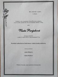 Rodina Hříbalova a Parýzkova oznamují, že zemřela paní Vlasta Parýzková.