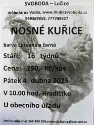 Firma Svoboda Lučice bude prodávat nosné kuřice v pátek 4. dubna 2025 v 10.00 hodin u OÚ.