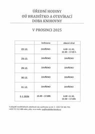 Oznamujeme občanům, že posledním úředním dnem v letošním roce bude pondělí 22.12.2025 6:00-11:30, 12:30-17:00h. Prvním úředním dnem v nové roce bude pondělí 5.1.2026. Knihovna bude v novém roce poprvé otevřena v pondělí 5.1.2025 13:30-17:00h.