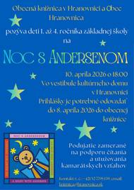 Obecná knižnica v Hranovnici a Obec Hranovnica, pozývajú deti 1. až 4. ročníka základnej školy na podujatie "Noc s Andersenom", ktoré sa uskutoční v piatok 10. apríla 2026.