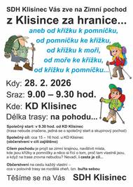SDH Klisinec Vás srdečně zve na tradiční procházku po okolí Klisince. Sraz v sobotu 28.2. v 9 h v KD Klisinec. Start v 9.30 h. Návrat v cca 15 h. Buřty s sebou, občerstvení po pochodu zajištěno.