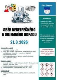 Obec Hrazany pořádá sběr nebezpečného a objemného odpadu dne 21. 3. 2026 způsobem realizovaným v loňském roce - převzetím přímo od občanů. Časový rozpis: 9.00 hod Klisinec, 9.30 hod. Dobrošov, 10.00 Hrazánky, 10.30 hod Hrazany. Odpad, který lze vytřídit nebude převzat.