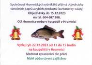 Spolek Hromnických rybníkářů přijímá objednávky na prodej vánočních kaprů a rybích pochoutek do 15.12.2023. Výdej ryb bude 22.12. od 11 do 15 hodin u koupaliště v Hromnici.