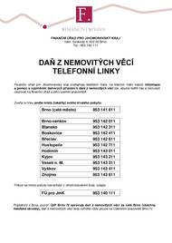Před 1 měsícemDaň z nemovitých věcí - telefonní linkyFinanční úřad pro Jihomoravský kraj zveřejňuje telefonní čísla, na kterých nabízí informace a pomoc s vyplněním daňových přiznání k dani z nemovitých věcí