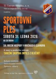 TJ Tatran Hrušky, z.s. Vás zve na tradiční sportovní ples v sobotu 31. ledna 2026 od 20 hodin v sále obecní hospody v Hruškách.