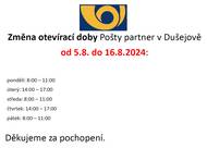 Změna otevírací doby Pošty partner v Dušejově 29.8.2024