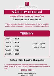 Před 6 dnyPracovníci Finanční správy poskytnou v Humpolci bezplatné konzultace k dani z nemovitých věcí. Konzultace se uskuteční v prvním patře budovy bývalého finančního úřadu v ulici Příčná 1525 v termínech 13/1, 15/1, 20/1, 22/1 a 29/1 vždy od 8 do 12 hodin a od 13 do 16 hodin.Městský rozpočet v letošním roce dosahuje téměř 770 milionů