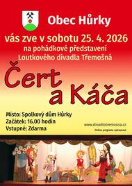 Obec Hůrky zve všechny malé i velké diváky na pohádkové představení „Čert a Káča“ v podání loutkového divadla Třemošná. Přijďte si užít odpoledne plné humoru a pohádkové atmosféry.