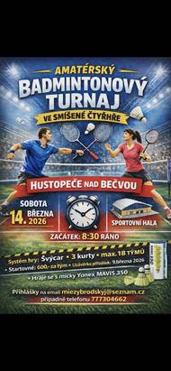 TJ Sokol Hustopeče nad Bečvou zve všechny milovníky sportu v sobotu 14.3.2026 od 9:00 hod. do sportovni haly v Hustopečích nad Bečvou na badmintonovy turnaj, kde své síly poměří místní i přespolní hráči ve smíšené čtyřhře. Občerstvení, dobrá nálada a zajimavé sportovnií vykony, to vše na jednom místě! Srdecně zvou pořadatelé.