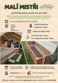 Zveme všechny malé kutily na první letošní workshop Malí Mistři, kde si děti vyzkouší práci s opravdovým nářadím a společně postaví nadzemní vyvýšené záhony. 📅 Středa 25. března 2026 📍 Hranice III – Velká, projekt Superhaus 🕘 Program: • školy: 9:00–12:00 • veřejnost: 14:00–18:00 👧👦 Pro děti od 6 let 🎽 každý malý mistr dostane tričko nebo kšiltovku 🍎 připraveno bude i drobné občerstvení ✅ účast je zdarma Cílem je dětem přiblížit řemeslo, manuální práci a vytvořit přátelskou a bezpečnou tvořivou atmosféru, která je pro projekt Malí Mistři typická. 📩 Přihlášky: tdg@volny.cz 📞 603 295 985 ℹ️ V případě špatného počasí bude termín po telefonické domluvě s přihlášenými účastníky posunut o 1–2 dny.