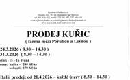 Drůbežárna Prace bude ve čtvrtek 5.3.2026 prodávat mladé kuřice a kohouty, krmivo pro drůbež a králíky, vitamínové doplňky a dále pak vykupovat králičí kožky - cena 10 Kč/ks. Prodej se uskuteční ve 13:30 hod. na náměstí v Hustopečích nad Bečvou.