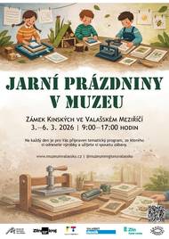 3.3.– 6.3.2026 od 9:00 do 17:00 hodin Zámek Kinských ve Valašském Meziříčí Děláte si plán na nadcházející jarní prázdniny a hledáte místo, kde se zabaví děti i dospělí? Vyrazte do Muzea regionu Valašsko na zámku Kinských ve Valašském Meziříčí, kde pro Vás připravili tradiční program pro rodiny s dětmi Jarní prázdniny v muzeu. Od úterý 3. do pátku 6. března Vás čekají různě zaměřené tvůrčí dílny, tradiční pátračka po zámku a spousta dalších hravých aktivit. Děti se skvěle zabaví také v multimediální expozici plné nejrůznějších her a interaktivit na téma člověk v krajině. K dispozici je i dětská herna. Na závěr své návštěvy si můžete dát „sladkou tečku“ ve zdejší stylové zámek kavárně. Více na https://www.muzeumvalassko.cz/akce-a-vystavy/jarni-prazdniny-v-muzeu-2