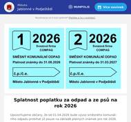 Upozorňujeme občany, že od 01.04.2026 bude vývoz směsného komunálního odpadu probíhat již pouze na základě platných známek pro rok 2026. Současně připomínáme, že poplatek za odpad a poplatek ze psů byl splatný do 31.03.2026. Žádáme občany, kteří dosud poplatek neuhradili, aby tak učinili v co nejkratší době.